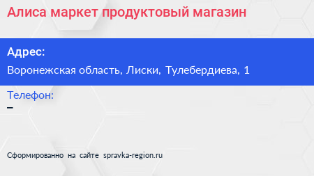 Алиса маркет, продуктовый магазин по адресу Воронежская область, Лиски, Тулебердиева, 1 в дальнейшем Организация, размещена в следующих категориях: