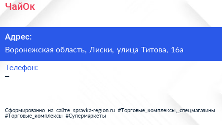 ЧайОк по адресу Воронежская область, Лиски, улица Титова, 16а в дальнейшем Организация, размещена в следующих категориях: