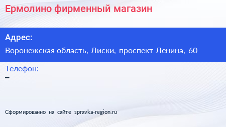 Ермолино, фирменный магазин по адресу Воронежская область, Лиски, проспект Ленина, 60 в дальнейшем Организация, размещена в следующих категориях:
