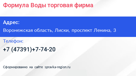 Формула Воды, торговая фирма по адресу Воронежская область, Лиски, проспект Ленина, 3 в дальнейшем Организация, размещена в следующих категориях:
