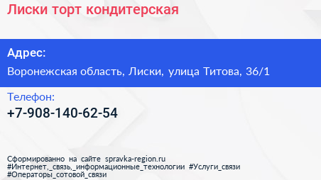 Лиски торт, кондитерская по адресу Воронежская область, Лиски, улица Титова, 36/1 в дальнейшем Организация, размещена в следующих категориях: