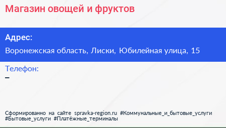 Магазин овощей и фруктов по адресу Воронежская область, Лиски, Юбилейная улица, 15 в дальнейшем Организация, размещена в следующих категориях: