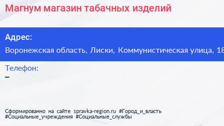 Магнум, магазин табачных изделий по адресу Воронежская область, Лиски, Коммунистическая улица, 18 в дальнейшем Организация, размещена в следующих категориях: