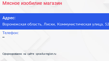 Мясное изобилие, магазин по адресу Воронежская область, Лиски, Коммунистическая улица, 52 в дальнейшем Организация, размещена в следующих категориях: