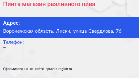 Пинта, магазин разливного пива по адресу Воронежская область, Лиски, улица Свердлова, 76 в дальнейшем Организация, размещена в следующих категориях: