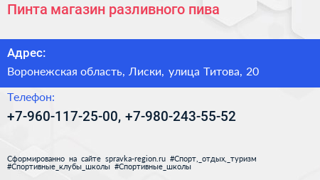Пинта, магазин разливного пива по адресу Воронежская область, Лиски, улица Титова, 20 в дальнейшем Организация, размещена в следующих категориях: