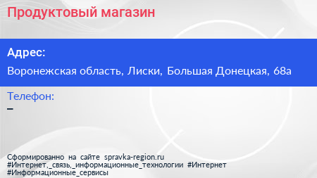 Продуктовый магазин по адресу Воронежская область, Лиски, Большая Донецкая, 68а в дальнейшем Организация, размещена в следующих категориях: