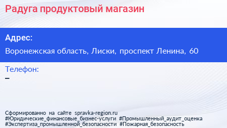 Радуга, продуктовый магазин по адресу Воронежская область, Лиски, проспект Ленина, 60 в дальнейшем Организация, размещена в следующих категориях: