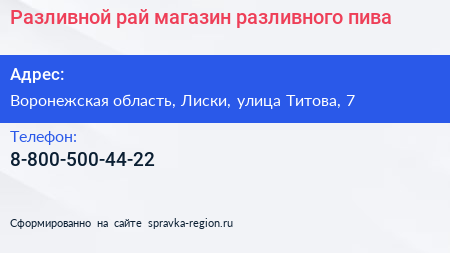 Разливной рай, магазин разливного пива по адресу Воронежская область, Лиски, улица Титова, 7 в дальнейшем Организация, размещена в следующих категориях: