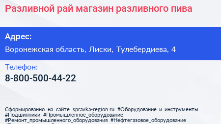 Разливной рай, магазин разливного пива по адресу Воронежская область, Лиски, Тулебердиева, 4 в дальнейшем Организация, размещена в следующих категориях: