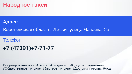 Народное, такси по адресу Воронежская область, Лиски, улица Чапаева, 2а в дальнейшем Организация, размещена в следующих категориях: