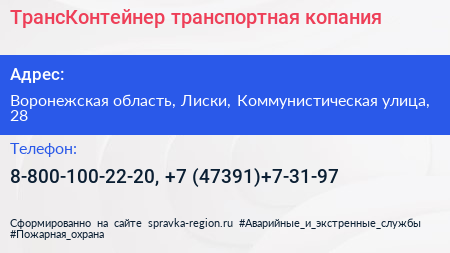 ТрансКонтейнер, транспортная копания по адресу Воронежская область, Лиски, Коммунистическая улица, 28 в дальнейшем Организация, размещена в следующих категориях: