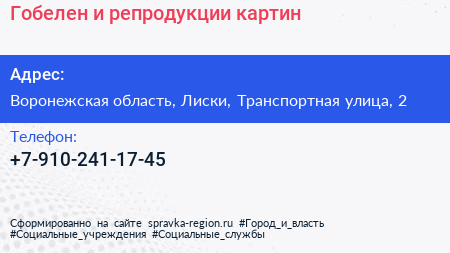 Гобелен и репродукции картин по адресу Воронежская область, Лиски, Транспортная улица, 2 в дальнейшем Организация, размещена в следующих категориях: