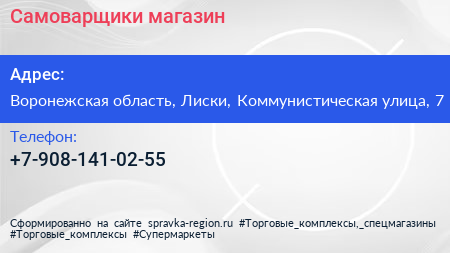 Самоварщики, магазин по адресу Воронежская область, Лиски, Коммунистическая улица, 7 в дальнейшем Организация, размещена в следующих категориях: