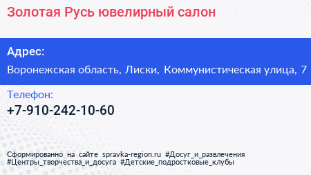 Золотая Русь, ювелирный салон по адресу Воронежская область, Лиски, Коммунистическая улица, 7 в дальнейшем Организация, размещена в следующих категориях:
