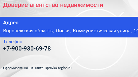 Доверие, агентство недвижимости по адресу Воронежская область, Лиски, Коммунистическая улица, 14 в дальнейшем Организация, размещена в следующих категориях: