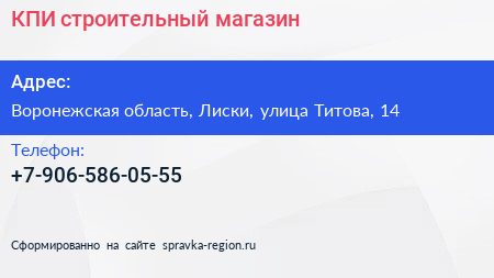 КПИ, строительный магазин по адресу Воронежская область, Лиски, улица Титова, 14 в дальнейшем Организация, размещена в следующих категориях: