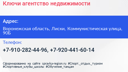 Ключи, агентство недвижимости по адресу Воронежская область, Лиски, Коммунистическая улица, 90Б в дальнейшем Организация, размещена в следующих категориях: