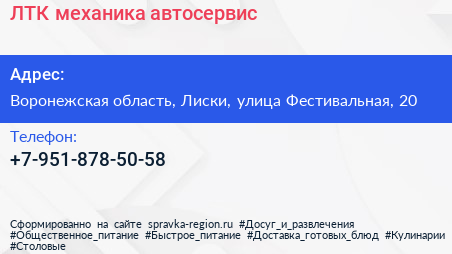 ЛТК-механика, автосервис по адресу Воронежская область, Лиски, улица Фестивальная, 20 в дальнейшем Организация, размещена в следующих категориях: