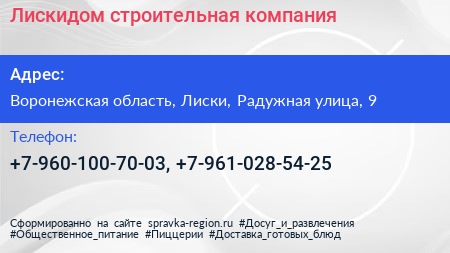 Лискидом, строительная компания по адресу Воронежская область, Лиски, Радужная улица, 9 в дальнейшем Организация, размещена в следующих категориях: