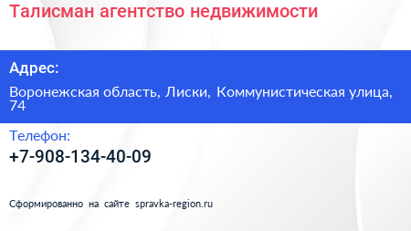 Талисман, агентство недвижимости по адресу Воронежская область, Лиски, Коммунистическая улица, 74 в дальнейшем Организация, размещена в следующих категориях: