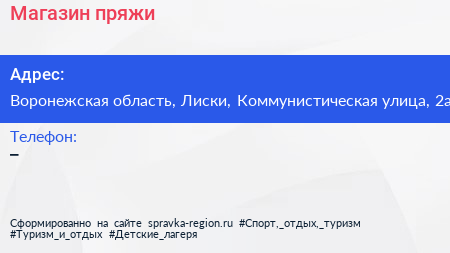 Магазин пряжи по адресу Воронежская область, Лиски, Коммунистическая улица, 2а в дальнейшем Организация, размещена в следующих категориях: