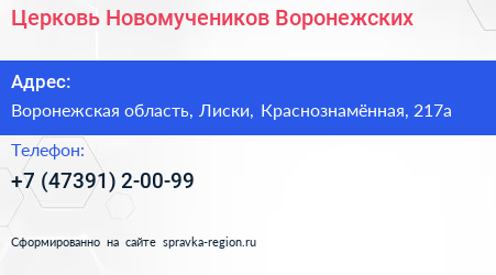 Церковь Новомучеников Воронежских по адресу Воронежская область, Лиски, Краснознамённая, 217а в дальнейшем Организация, размещена в следующих категориях: