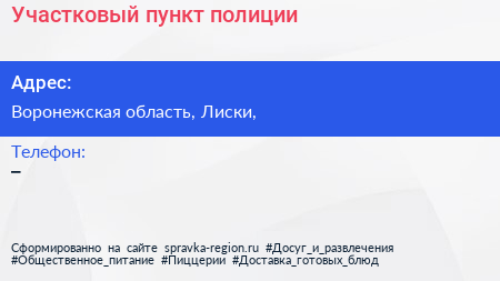 Участковый пункт полиции по адресу Воронежская область, Лиски, в дальнейшем Организация, размещена в следующих категориях: