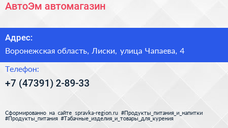 АвтоЭм, автомагазин по адресу Воронежская область, Лиски, улица Чапаева, 4 в дальнейшем Организация, размещена в следующих категориях:
