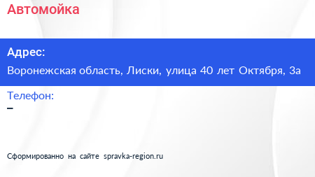 Автомойка по адресу Воронежская область, Лиски, улица 40 лет Октября, 3а в дальнейшем Организация, размещена в следующих категориях: