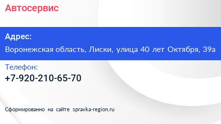 Автосервис по адресу Воронежская область, Лиски, улица 40 лет Октября, 39а в дальнейшем Организация, размещена в следующих категориях: