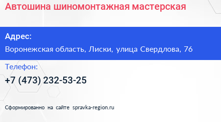 Автошина, шиномонтажная мастерская по адресу Воронежская область, Лиски, улица Свердлова, 76 в дальнейшем Организация, размещена в следующих категориях: