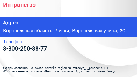 Интрансгаз по адресу Воронежская область, Лиски, Воронежская улица, 20 в дальнейшем Организация, размещена в следующих категориях: