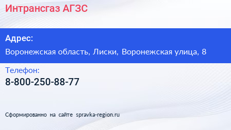 Интрансгаз, АГЗС по адресу Воронежская область, Лиски, Воронежская улица, 8 в дальнейшем Организация, размещена в следующих категориях: