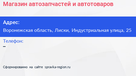 Магазин автозапчастей и автотоваров по адресу Воронежская область, Лиски, Индустриальная улица, 25 в дальнейшем Организация, размещена в следующих категориях: