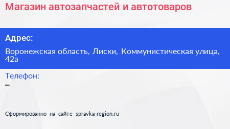 Магазин автозапчастей и автотоваров по адресу Воронежская область, Лиски, Коммунистическая улица, 42а в дальнейшем Организация, размещена в следующих категориях: