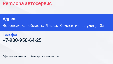 RemZona, автосервис по адресу Воронежская область, Лиски, Коллективная улица, 35 в дальнейшем Организация, размещена в следующих категориях: