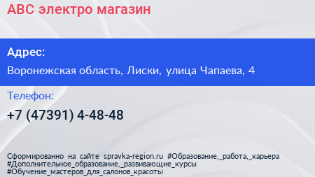 АВС-электро, магазин по адресу Воронежская область, Лиски, улица Чапаева, 4 в дальнейшем Организация, размещена в следующих категориях:
