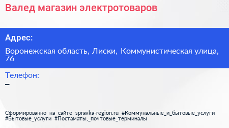 Валед, магазин электротоваров по адресу Воронежская область, Лиски, Коммунистическая улица, 76 в дальнейшем Организация, размещена в следующих категориях: