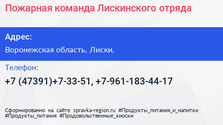 Пожарная команда Лискинского отряда по адресу Воронежская область, Лиски, в дальнейшем Организация, размещена в следующих категориях: