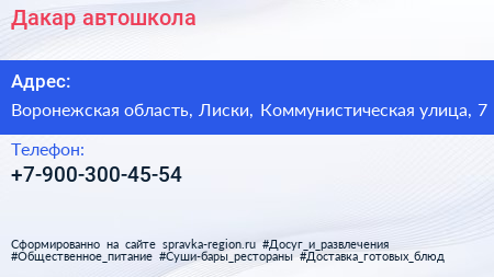 Дакар, автошкола по адресу Воронежская область, Лиски, Коммунистическая улица, 7 в дальнейшем Организация, размещена в следующих категориях: