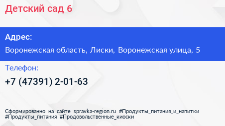 Детский сад №6 по адресу Воронежская область, Лиски, Воронежская улица, 5 в дальнейшем Организация, размещена в следующих категориях: