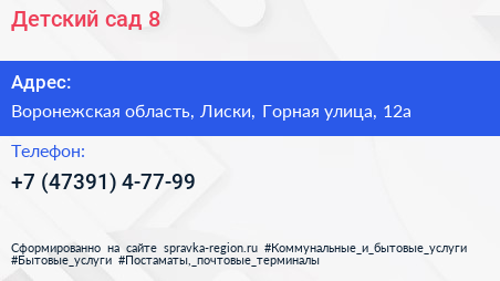 Детский сад №8 по адресу Воронежская область, Лиски, Горная улица, 12а в дальнейшем Организация, размещена в следующих категориях: