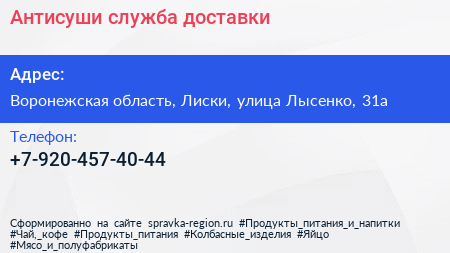 Антисуши, служба доставки по адресу Воронежская область, Лиски, улица Лысенко, 31а в дальнейшем Организация, размещена в следующих категориях: