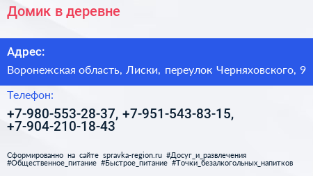 Домик в деревне по адресу Воронежская область, Лиски, переулок Черняховского, 9 в дальнейшем Организация, размещена в следующих категориях: