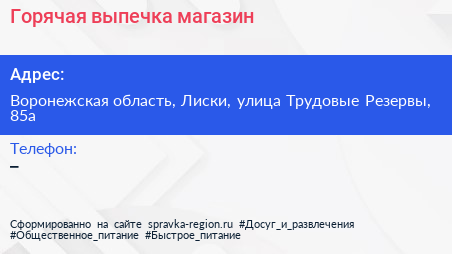 Горячая выпечка, магазин по адресу Воронежская область, Лиски, улица Трудовые Резервы, 85а в дальнейшем Организация, размещена в следующих категориях: