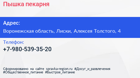 Пышка, пекарня по адресу Воронежская область, Лиски, Алексея Толстого, 4 в дальнейшем Организация, размещена в следующих категориях:
