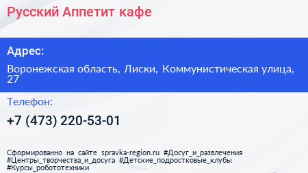 Русский Аппетит, кафе по адресу Воронежская область, Лиски, Коммунистическая улица, 27 в дальнейшем Организация, размещена в следующих категориях: