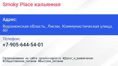 Smoky Place, кальянная по адресу Воронежская область, Лиски, Коммунистическая улица, 60 в дальнейшем Организация, размещена в следующих категориях: