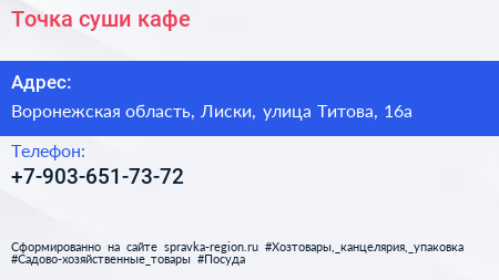 Точка суши, кафе по адресу Воронежская область, Лиски, улица Титова, 16а в дальнейшем Организация, размещена в следующих категориях:
